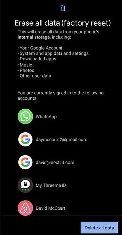 • Seleccione Borrar todos los datos (restablecimiento de fábrica)