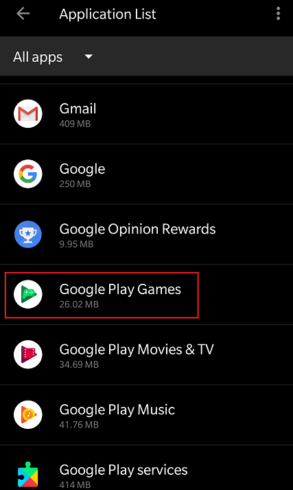 • Desplácese hacia abajo y busque Google Play Games y tóquelo