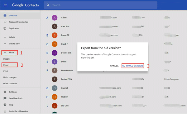 Esta ventana emergente muestra que esta versión de vista previa de Contactos de Google aún no admite la exportación. Debe tocar la opción IR A LA VERSIÓN ANTIGUA para continuar el proceso de exportación.