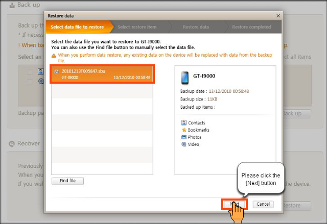Paso 3: luego haga clic en el archivo respaldado y luego en Siguiente para restaurar